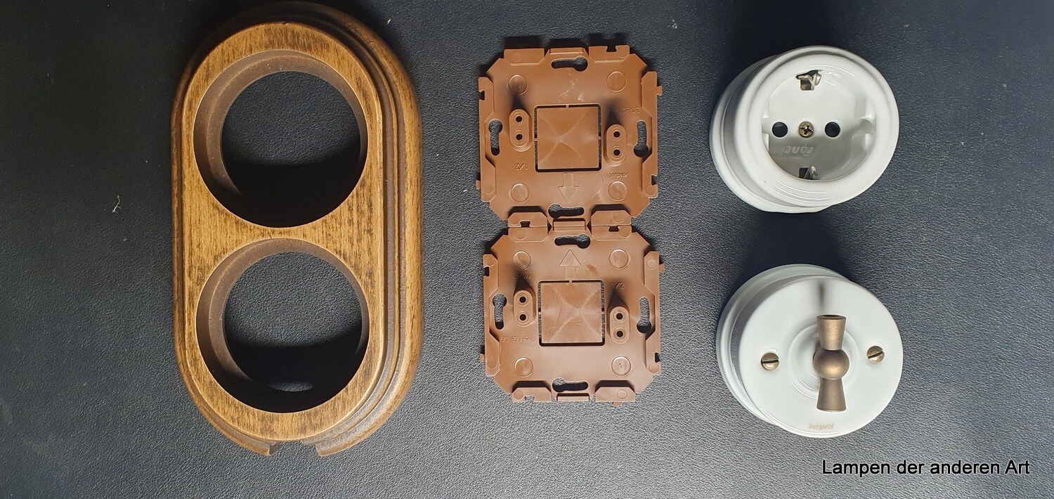 Diese Schalter-Steckdosen Variation aus edlem weißem Porzellan, eingebettet in einem ansprechenden 2fach Massivholzrahmen aus gealteter Buche, vereint zeitloses Design mit modernen Sicherheitsstandards. Als Schalter kommt ein Aus-Wechsel Mechanismus zum Einsatz (für beide Schaltungsvarianten geeignet). Diese Geräteverbindung ist auch mit einem Serienschalter in unserem Shop verfügbar (wenn Sie mit einem Schalter zwei verschiedene Leuchten schalten wollen – bei herkömmlichen Schaltern Doppelwippe - in der Artikelnummer steht anstatt - AW dann - SS). Mit seinem Drehknebel aus Messing patiniert verleiht er der Kombination eine einzigartige Vintage-Note und sorgt für eine angenehme Bedienung. Der integrierte weiße Schuko-Steckdoseneinsatz ist mit einem effektiven Kinderschutz ausgestattet. Dunkel patinierte sichtbare Befestigungsschrauben ergänzen das Gesamtbild. Die Montage ist auf Putz oder auf gängigen Unterputzdosen möglich und ermöglicht somit eine problemlose Integration in bestehende und neue Elektroinstallationen. Die Installationsmaße finden Sie in den Bildern der Artikelbeschreibung.