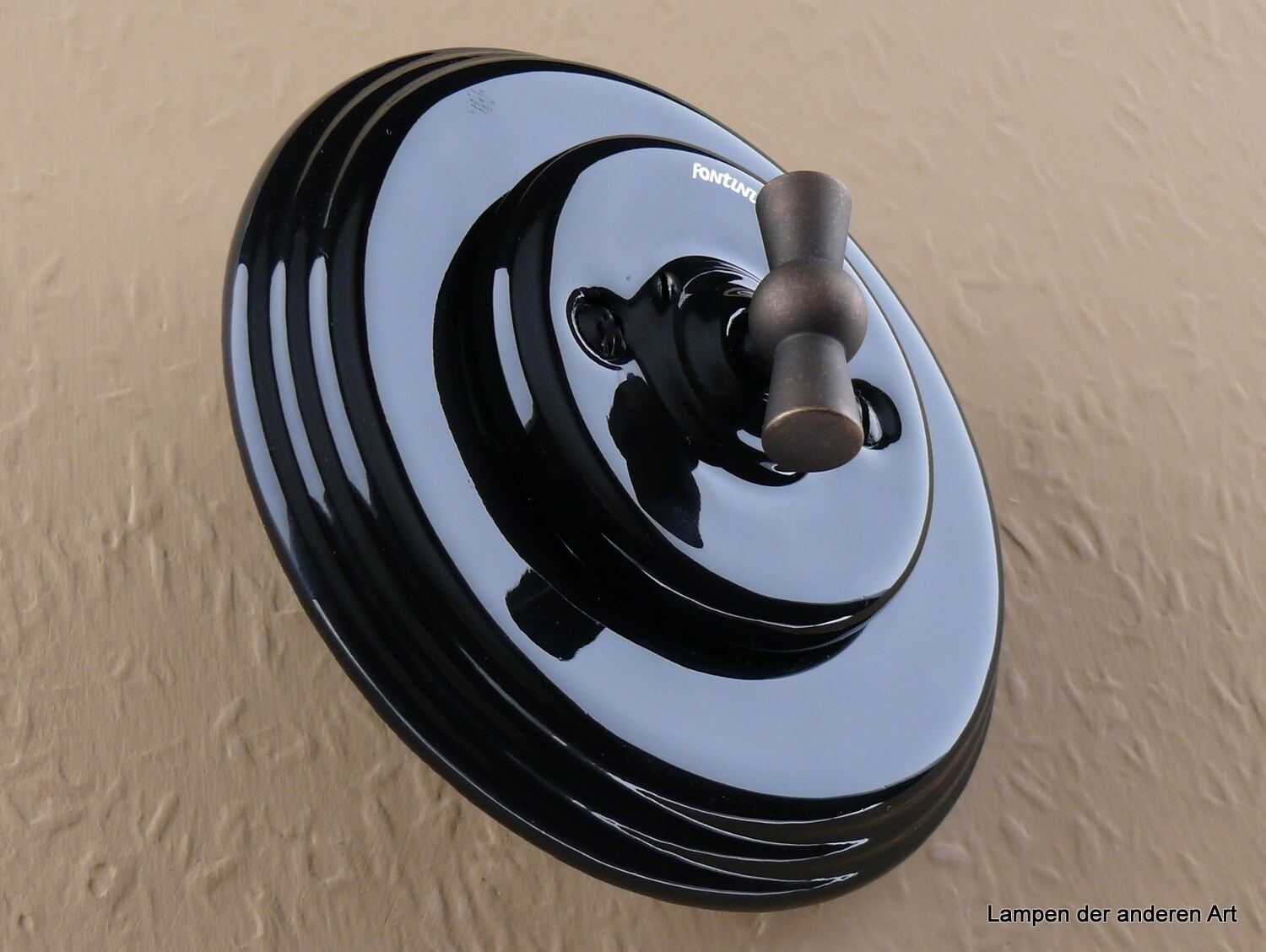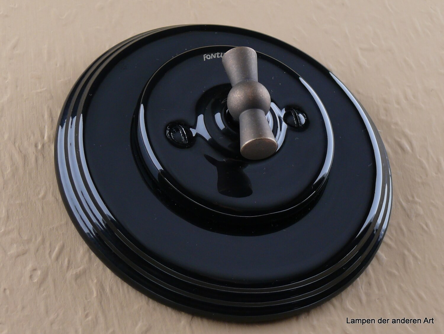 Mit seinem runden profilierten Einfachrahmen aus schwarzem Porzellan, ist er eine Hommage an den guten alten Porzellandrehschalter, der in vergangenen Zeiten weit verbreitet war. Das zeitlose Design und die hochwertigen Materialien bringen einen Hauch von Nostalgie und Eleganz in Ihre Räume.